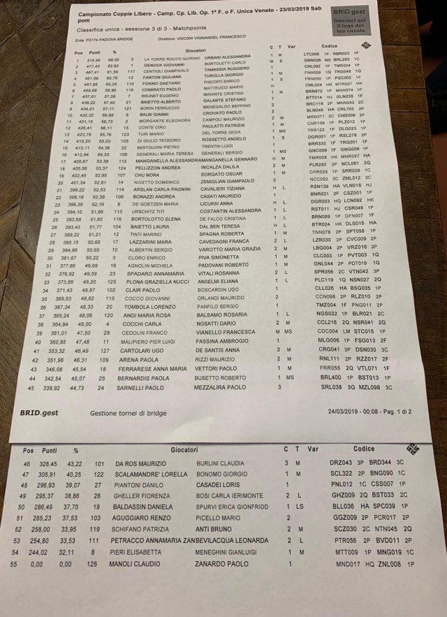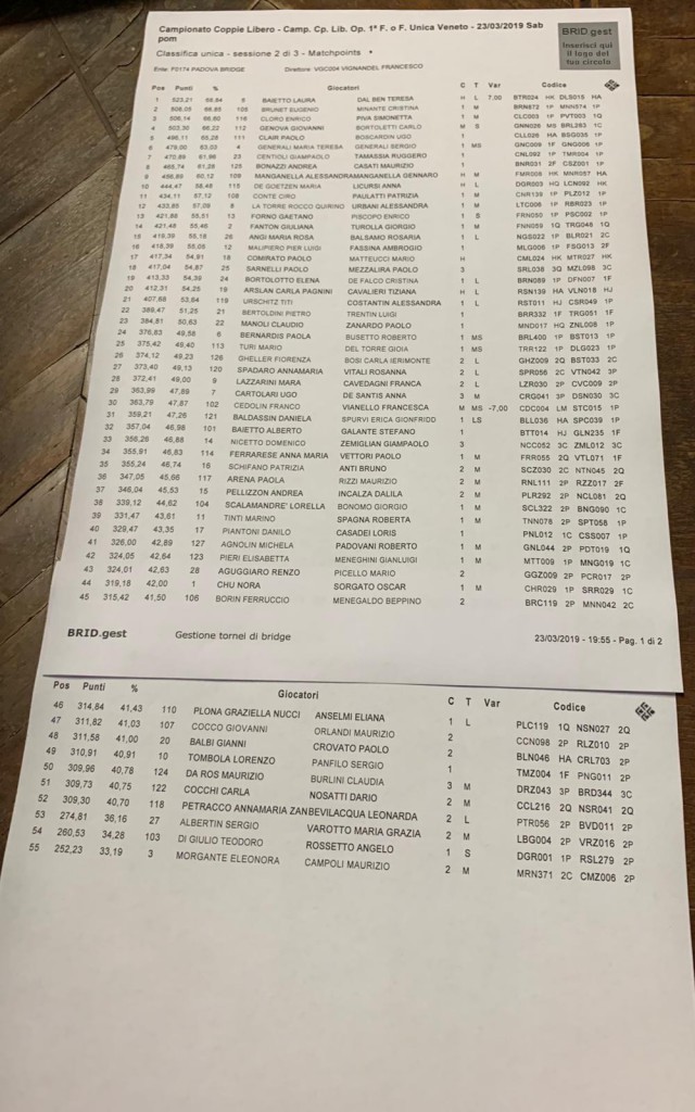 Si è svolto oggi 23 Marzo il Campionato Regionale a coppie Open con 55 coppie partecipanti, unico girone in tre turni di gara di 20 mani ciascuno. La direzione è stata affidata a Francesco Vignandel.